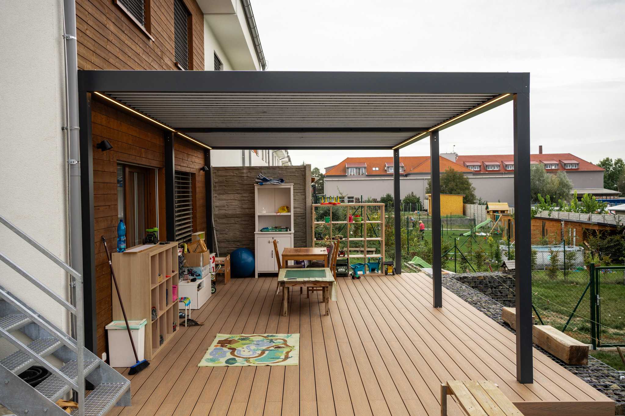 - możliwość zastosowania paska LED po bokach i na obwodzie przedłużenia pergoli lub zastosowanie reflektorów LED zintegrowanych z listwami
