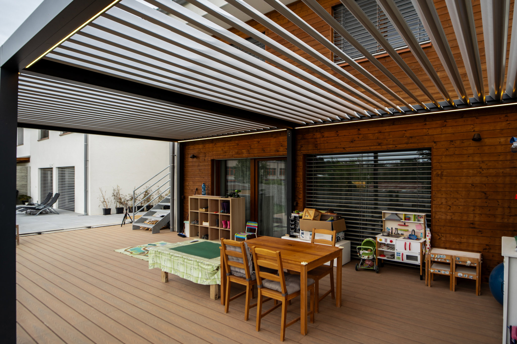 Aluminiowe lamele można ustawiać od 0° do 130°, oczywistością jest uszczelnienie i nachylenie lameli do kontrolowanego odprowadzania wody słupkiem. Do szerokości 4000 mm nośność lameli wynosi do 116 kg/m2. Od szerokości 4000 mm nośność lameli wynosi do 90 kg/m2.Do pergoli można integrować elementy zaciemniające i oświetlenie LED.